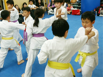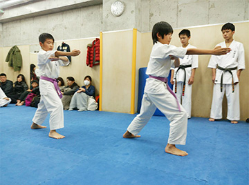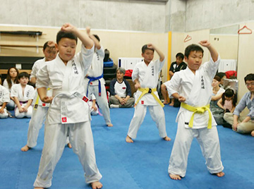 基本的な動作、型、基礎体力向上から始まり、級や学年に合わせ、約束組手、分解組手、自由組手へと進みます。